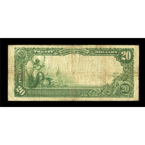 <B>Charlottesville, VA</B></I> - $20 1902 Plain Back Fr. 657 <B>NB & TC</B></I> Ch. # 10618<BR> This new to the census discovery raises the number of large notes bearing this title to all of two, with the other example not appearing publicly since an auction offering nearly ten years ago. Notes with this title were issued for only fourteen months, making their scarcity no surprise. Nice <B>Fine,</B></I> with clear red signatures. <BR><BR><b>Shipping:</b> Coins & Currency (<a target="_blank" href="http://www.heritageauctions.com/common/shipping.php">view shipping information</a>)