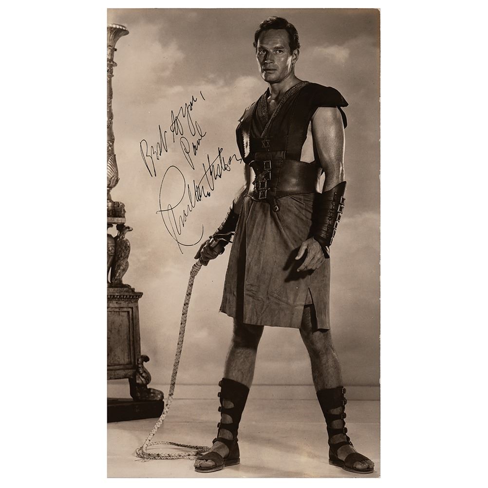 Vintage matte-finish 7 x 12 full-length publicity photo of Charlton Heston as Judah Ben-Hur from the record-breaking 1959 film Ben-Hur, signed and inscribed in black ink, "Best to you, Paul, Charlton Heston.‰Û In fine condition, with trimmed edges, and faint surface impressions running across his chest.