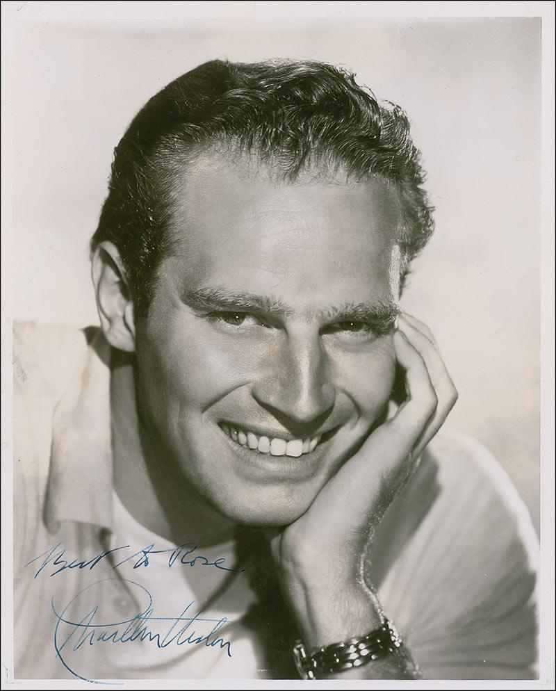 Vintage glossy 8 x 10 photo of a young Heston resting his head in his hand, signed and inscribed in fountain pen “Best to Rose, Charlton Heston.” Some scattered light surface marks, and some light curling from mounting remnants on reverse, otherwise fine condition.