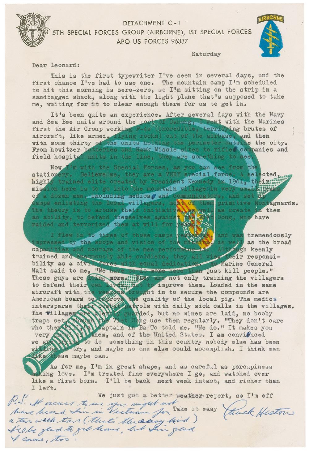 TLS signed “Chuck Heston,” one page, 7 x 10.5, Colorful Detachment C-1, 5th Special Forces Group, 1st Special Forces letterhead, no date, but postmarked January 24, 1966. Letter written while on a two-week tour of Vietnam, to Leonard Lyons of the New York Post. In part: “This is the first typewriter I have seen in several days…The mountain camp I’m scheduled to hit this morning is zero-zero, so I’m sitting on the strip in a sandbagged shack…It’s been quite an experience. After several days with the Navy and Sea Bee units around the port of Danang, I went with the Marines first the Air Group working F-4s (incredible, terrifying brutes of aircraft, like armed, flying rocks) out of the airbase, and then with some thirty of the units holding the perimeter outside the city…Now I’m with the Special Forces…Believe me, they are a VERY special force. A selected, highly trained elite created by President Kennedy in 1961, their mission here is to go into the mountain villages in very small teams of a dozen men…and set up camps enlisting the local villagers, most of them primitive Montagnards…I flew into three of those camps yesterday and was tremendously impressed…As for me, I’m in great shape, and as careful as porcupines making love. I’m treated fine everywhere I go, and watched over like a first born. I’ll be back next week intact, and richer than I left.” Heston also adds a short handwritten postscript at the bottom, “It occurs to me you might not have heard I’m in Vietnam for a two week tour (that’s the easy kind). I’ll be glad to get home, but I’m glad I came, too.” In fine condition, with some scattered light toning. Accompanied by the original mailing envelope, addressed by Heston, and signed in the return address area “C. Heston.” At the time, Heston was a staunch opponent of the Vietnam War, an opinion he would change years after. An incredible letter, brimming with fine firsthand content.