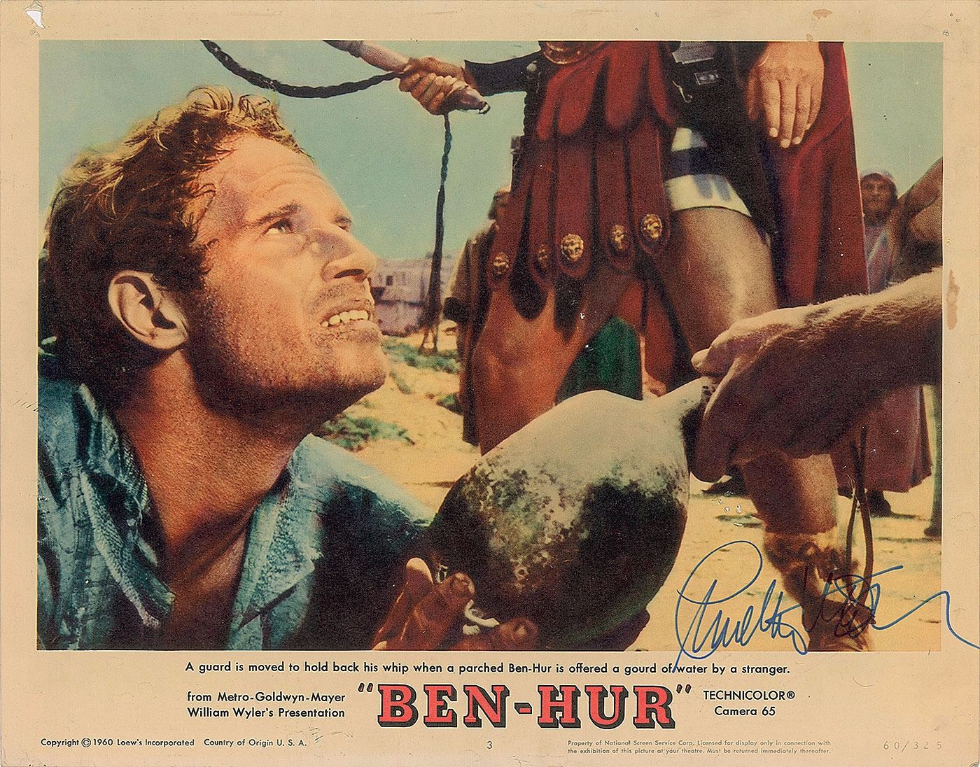 Color 14 x 11 lobby card for the classic Ben-Hur, signed in black felt tip by Heston. In very good to fine condition, with some staining to borders and tack holes and small areas of paper loss to upper corners. From the Harvey and Rhoda Kuflik Collection.