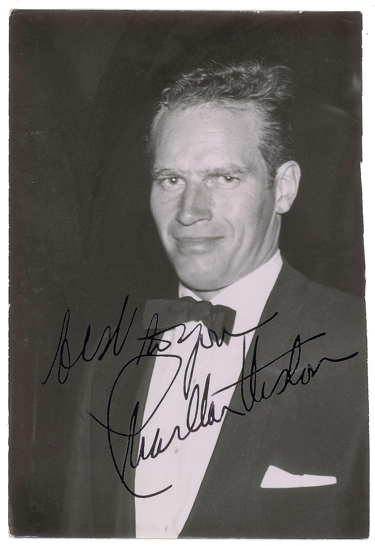 Vintage glossy 3.25 x 5 bust-length photo of Heston at a black tie affair, signed in fountain pen, "Best to you, Charlton Heston." In fine condition.
