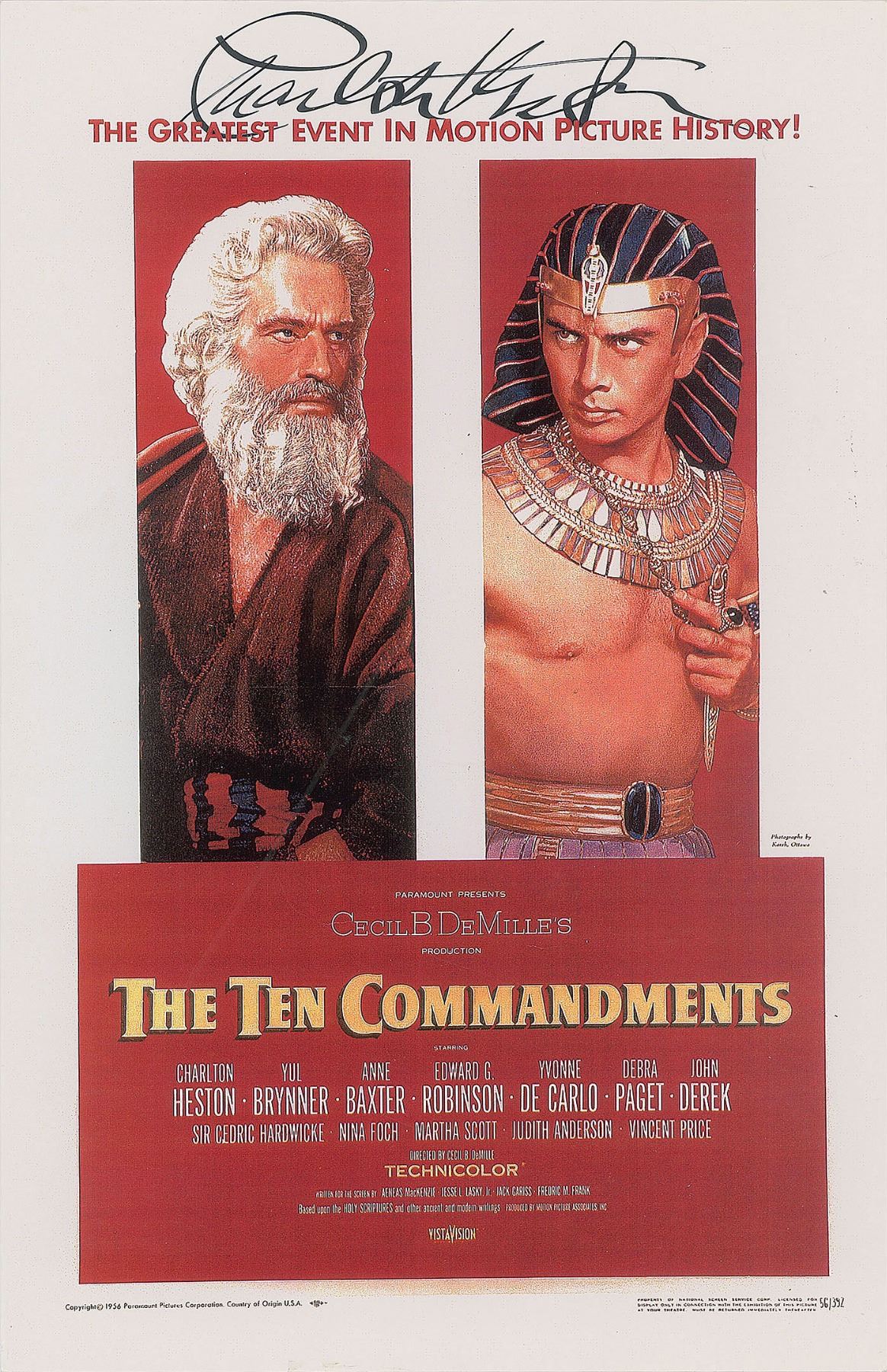 Color glossy 11 x 17 double-weight photo of the poster for Cecil B. DeMille's 1956 biblical epic The Ten Commandments, signed along the top in black felt tip by Charlton Heston. In fine condition. Originally obtained by in-person specialist Mike Wehrmann.