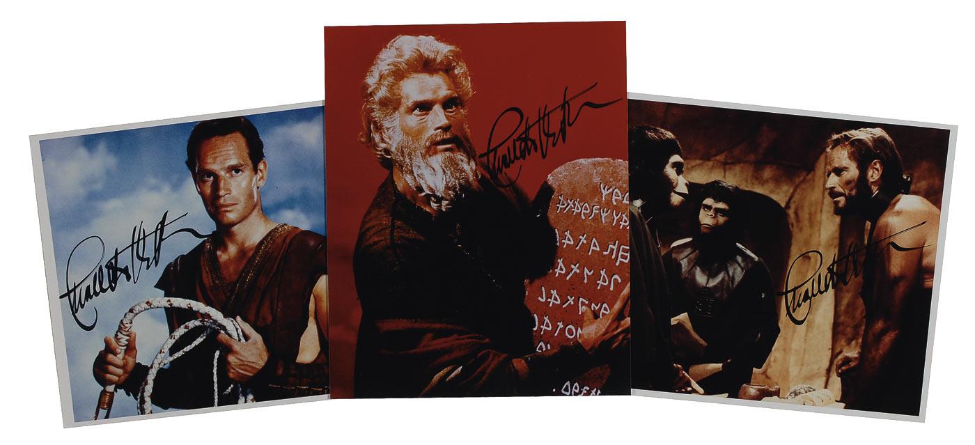 Three color glossy photos, one 8 x 10 and two 10 x 8, from three of his most recognized films (The Ten Commandments, Ben-Hur, and Planet of the Apes), each signed in black felt tip by Heston. In very fine condition. Pre-certified PSA/DNA and RRAuction COA.