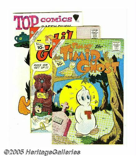 <B>Charlton Silver Age Box Lot (Charlton, 1961-67) Condition: Average FN.</B></I> Full long box lot of Charlton books includes <B>Fightin' Army</B></I> #44 (five copies); <B>Fightin' Navy</B></I> #102 (seven copies); <B>Top Comics: Walt Disney Super Goof</B></I> #1 (eight copies); <B>Atomic Mouse</B></I> #47 (46 copies); <B>My Little Margie</B></I> #40 (18 copies); <B>Timmy the Timid Ghost</B></I> #31 (50 copies); <B>Li'l Genius</B></I> #37 (31 copies); and <B>Teen-Age Confidential Confessions</B></I> #10 (24 copies); plus <B>Mutt and Jeff</B></I> #118 (21 copies); <B>Spooky</B></I> #46 (16 copies), and a few assorted issues of other titles such as <B>Fightin' Air Force</B></I> and <B>Marine War Heroes</B></I>. Most are in FN condition, but many grade from VG to VF. Approximate Overstreet value for group = $2,500.