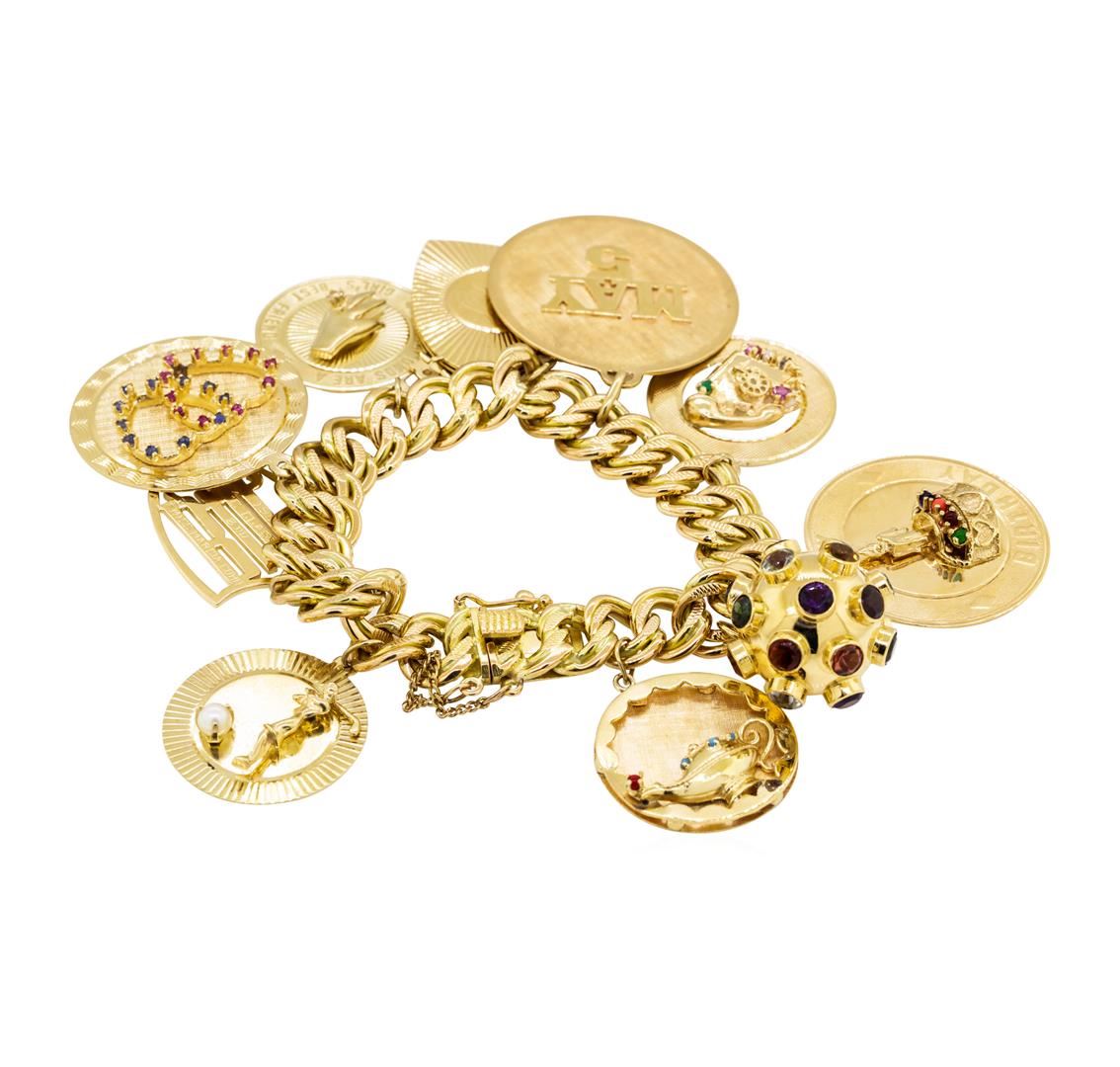 One charm bracelet measuring seven inches in length with ten attached charms and a safety chain featuring: 14KT yellow gold weighing 113.5 grams.