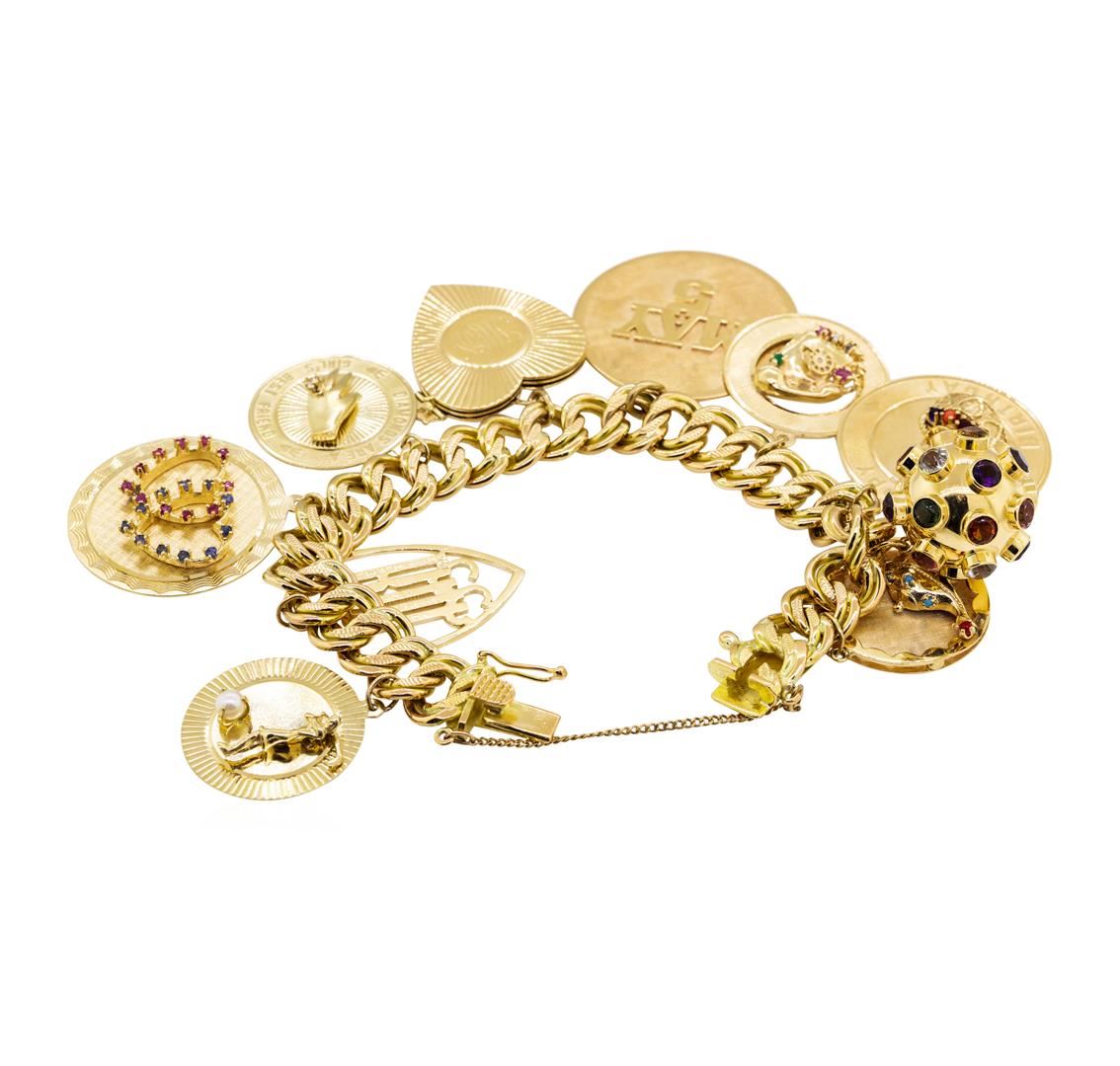 One charm bracelet measuring seven inches in length with ten attached charms and a safety chain featuring: 14KT yellow gold weighing 113.5 grams.
