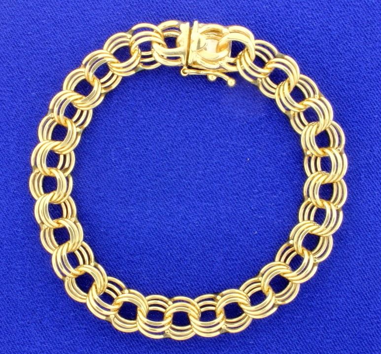 In 14K yellow gold it is 7 1/2 inches long and 10mm thick, with safety clasp. 21.6g