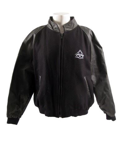 From the hit WB TV series Charmed (1998–2006) is a special cast and crew Charmed varsity jacket. This is a black varsity jacket with the Charmed logo on the front, leather sleeves and front pocket zipper and is a size large.