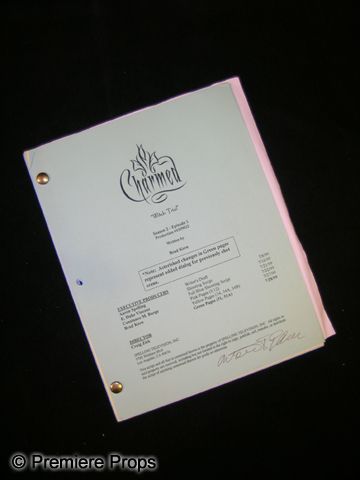A script from the Fantasy-Comedy TV series 'Charmed' that ran from 1998-2006. The script is for the Season 2/Episode #1 show entitled 'Witch Trial' that aired 9/30/99. A couple of pages have highlighting. Also included are two pages of notes for the pronunciation of certain phrases. Unknown signature on lower right corner of cover.
