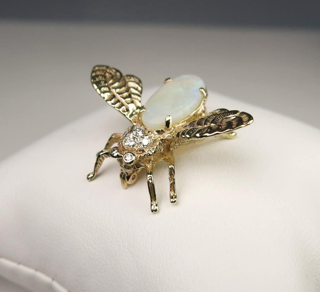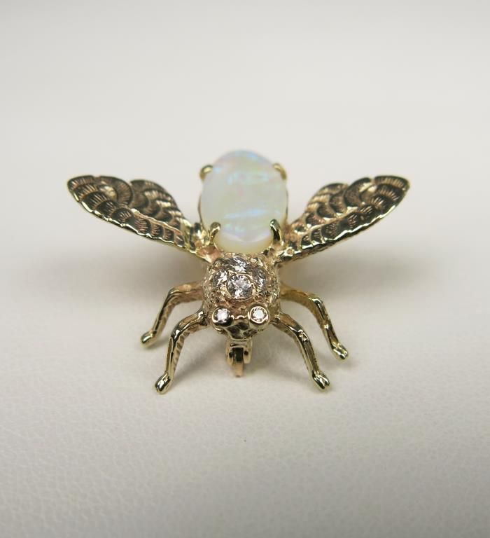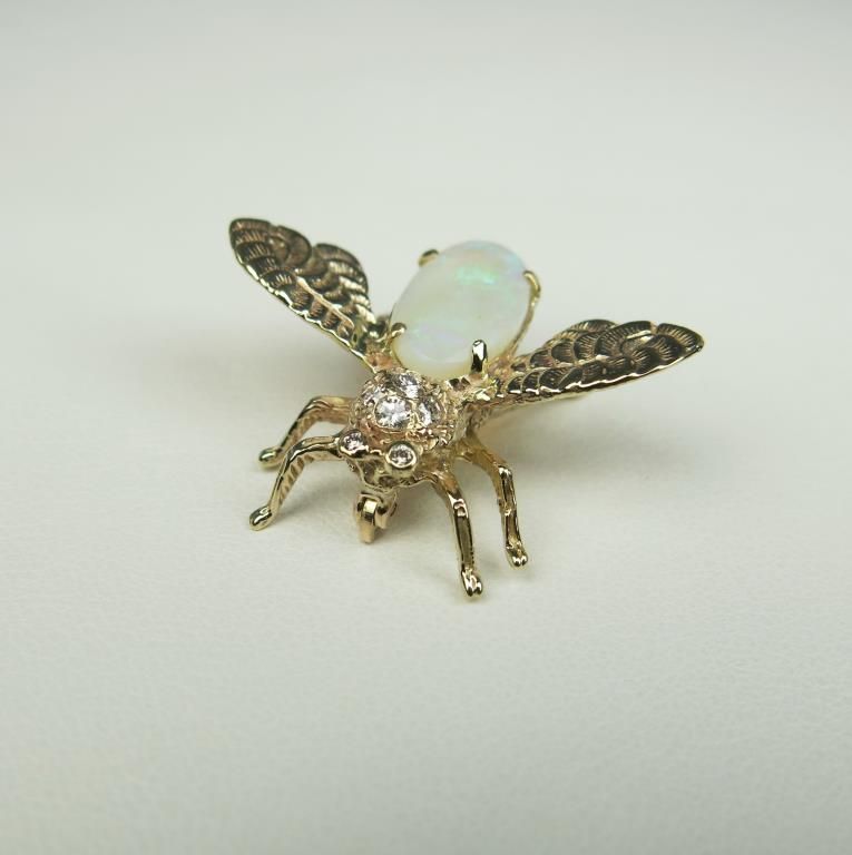 Charming 10 karat ladies custom made ‘BEE’ pin set with an Australian Opal and diamonds. Retail $1,000-$1,500 Estimate $600-$900 Nice