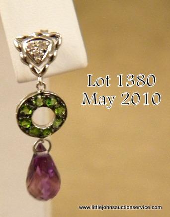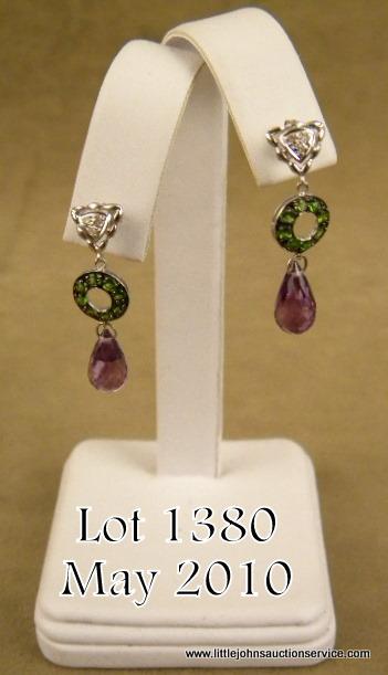 Charming 10 karat white gold ladies drop design earrings set with a combination of Amethyst, diamond and Tsavorite garnet weighing approx. 4.00 carats. Retail $850.00 Estimate $200-$300