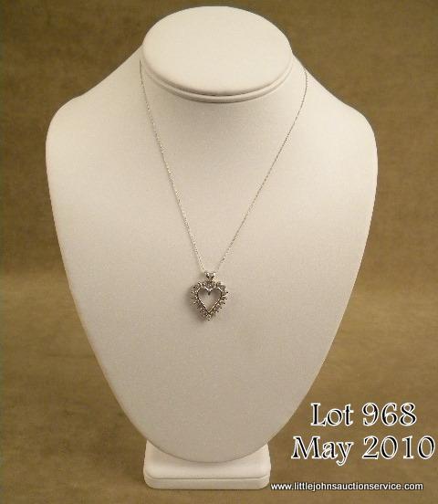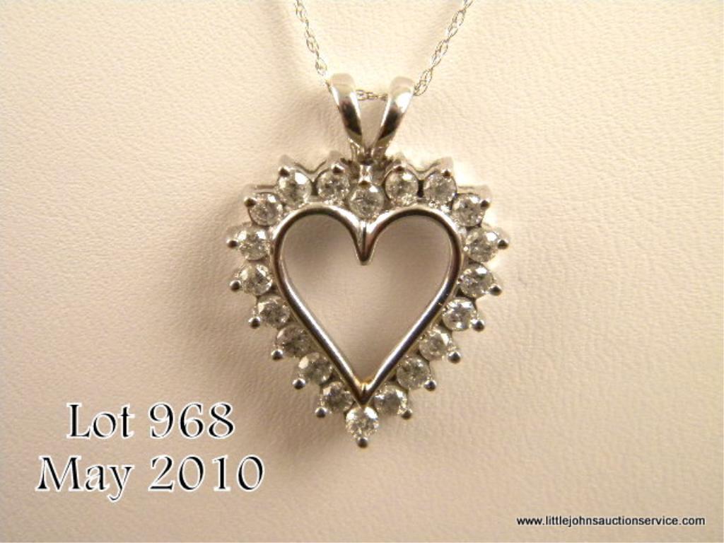 Charming 10 karat white gold ladies heart design necklace set with 20 round diamonds weighing over 1.00 carat of F-G colors. Retail $1,150.00 Estimate $300-$500
