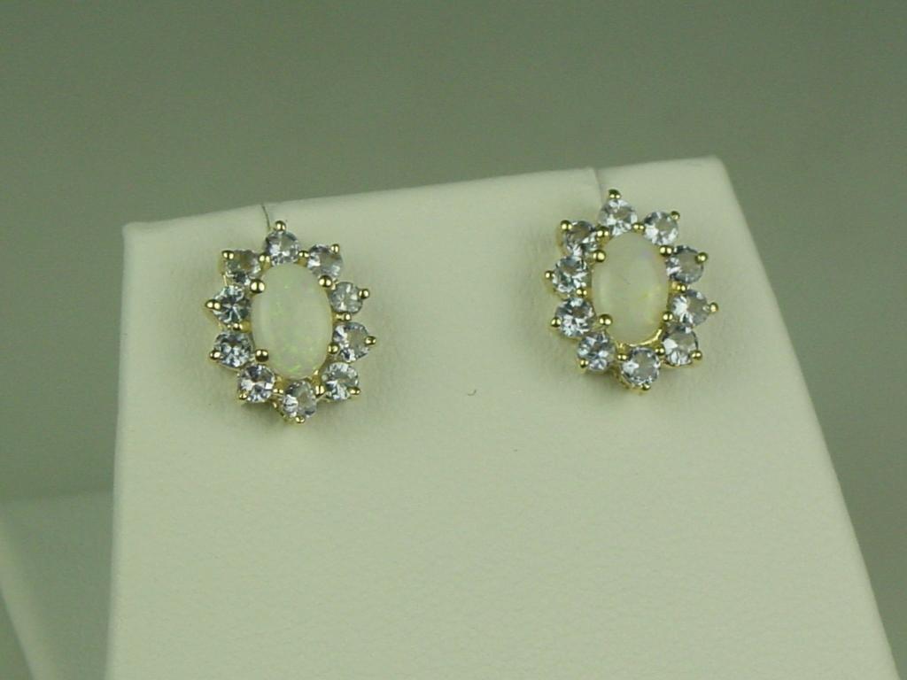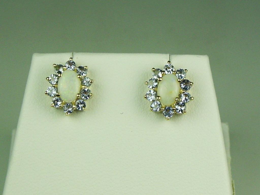 Charming 10 karat yellow gold ladies earrings set with two opals and 20 round Tanzanites weighing approx. 3.00 carats. Retail $995.00 Estimate $200-$400