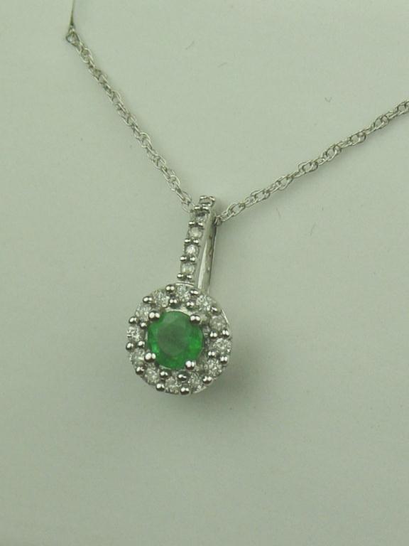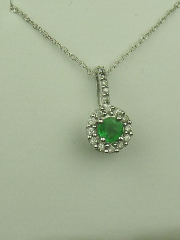 Charming 10K White Gold Ladies Necklace Set with a round emerald of over 0.50 carats and pave set with 16 round diamonds weighing approx. 0.20 carats of G-H colors and SI clarity. Retail: $995.00Set with a round emerald of over 0.50 carats and pave set with 16 round diamonds weighing approx. 0.20 carats of G-H colors and SI clarity. Retail: $995.00