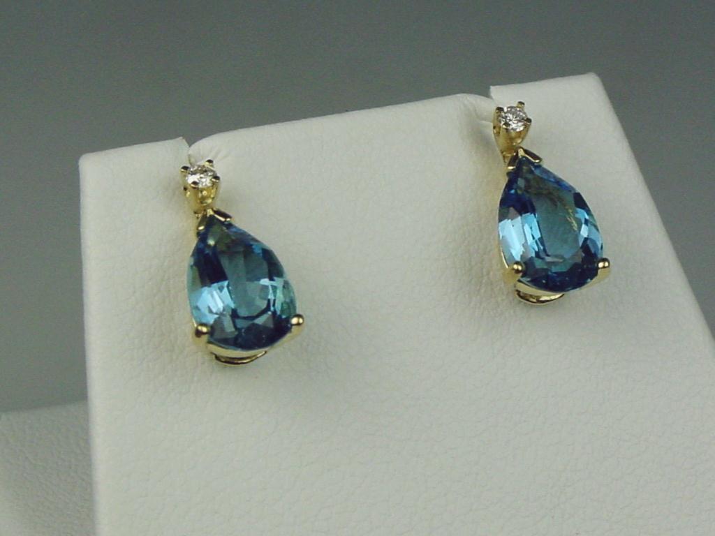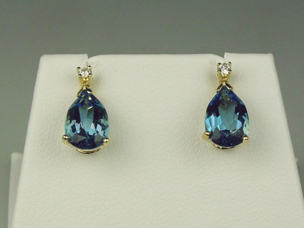 Charming 14K Yellow Gold Ladies Earrings Set with two matching pear shaped blue Topaz weighing approx 3.00 carats and side diamonds. Retail $995.00Set with two matching pear shaped blue Topaz weighing approx 3.00 carats and side diamonds. Retail $995.00