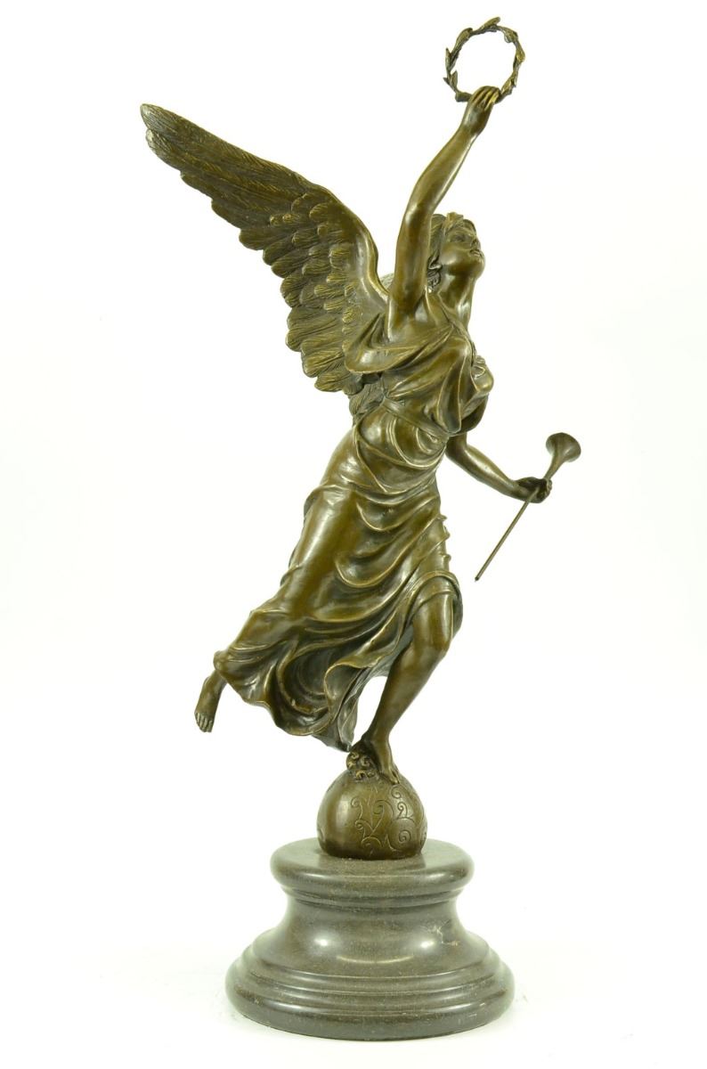 This Charming Angel Stand Atop A Rock About To Fly Away As She Is About To Blow On Her Horn And On Her Other Hand She Holds A Halo Of Leaves. Her Hand Is Raised High And Her Right Leg Is Lift Back, She Looks Up At The Blue Skies And She Starts To Take Lift For She Could Fly To Her Destination. Her Dress Is Beautifully Framed For Her Body Not To Lose Nor Tight. Her Hair Is Tied Back In A Perfect Yet Messy Bun To Let Us See Her Gorgeous Face. 100% Bronze And Handmade, This Brown Patina Sculpture Was Cast Using The "Lost Wax Method" And Mounted On A Marble Base. Bronze Dimensions With Marble Base: Height 25 X Width 15 inches. Weight: 20 Lbs.