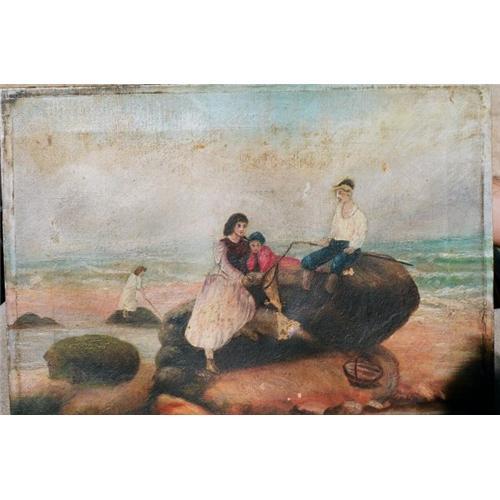 Super charming primitive oil painting of small family by the sea! Pastels and earth tones in this innocent rendering, most probably by a child at the turn of the century, depicting a father, mother and children fishing and playing by the ocean's edge. One inch tear in center and three small punctures make this treasure a candidate for a professional cleaning and repair (add $100.00 for this service), but piece may be enjoyed as is by true lover of primitive antiques...Thanks for looking, Chas.