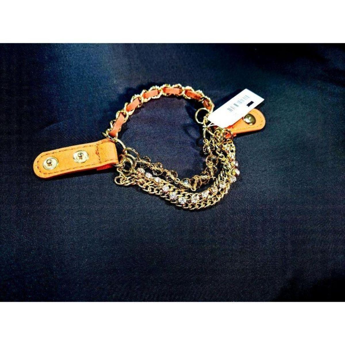 This notable fashion designer brand incorporates chains, bangles, crystals, and leather to form an eye-catching contemporary bracelet.Â