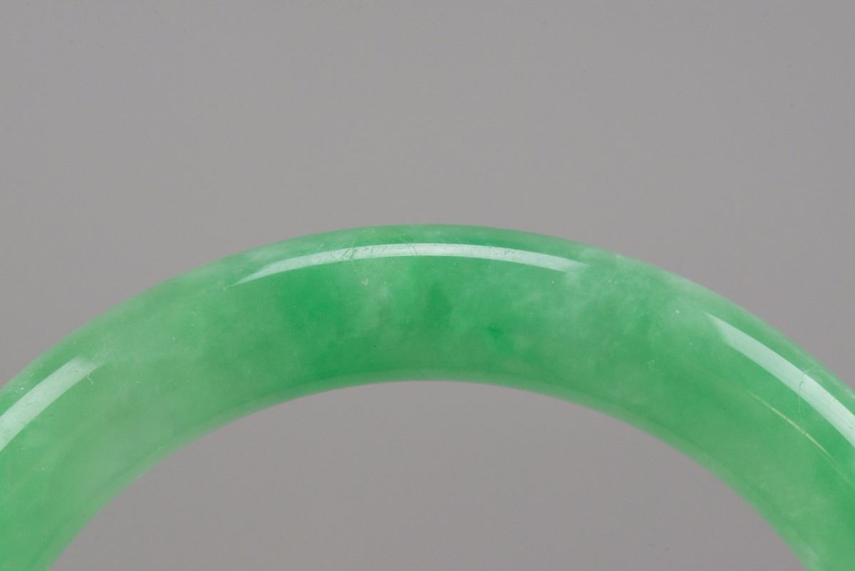 Charming Chinese circular jadeite bangle, of apple green tone with good translucency, rounded edge, D: 8.5 cm, inner D: 6.4 cm, 71 grams (wood stand not included), density: 3.29