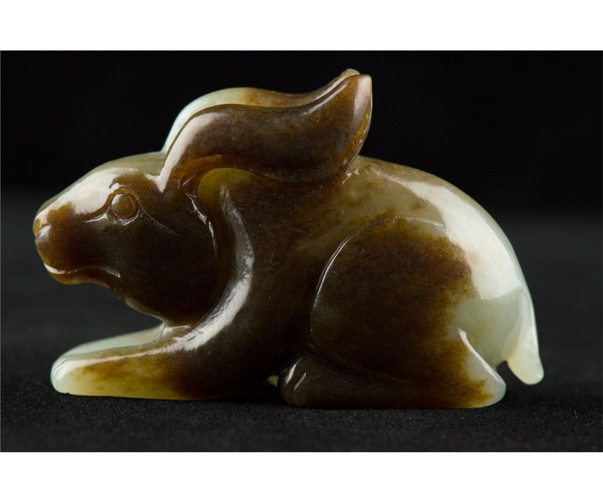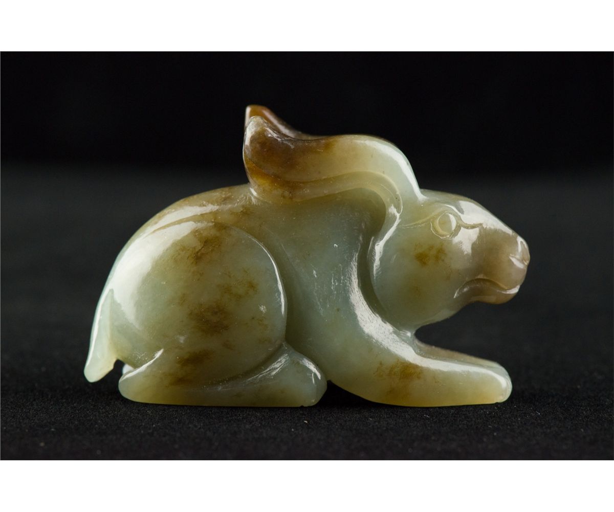Charming Chinese white jade carved figure, featuring a rabbit. The stone of white with russet suffusions. H: 4 cm, L: 6.5 cm, 72 grams. Provenance: T. Ng Collection Toronto.