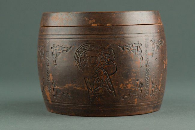 Charming Chinese Zisha carved box, of drum form, carved continuous scenes of children with auspicious words. Bottom marked Qing Xianfeng year with artist seal; H: 10 cm, W: 12 cm, 893 grams