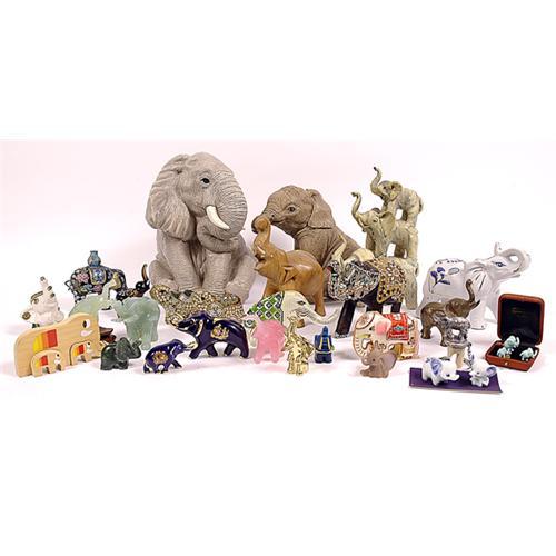 <Our item number 136531><B>Assorted Elephant Collection.</B> This diverse set features approximately 122 curios depicting the lucky and beloved elephant in almost every shape, size, and form. Includes mostly hand-crafted figurines, but also several containers, cork toppers, pins, pendants, letter openers, a coin bank, card holder, bell, paperweight, and a soap dispenser. Noted makers include Limoges, Murano, Lenox, and Cristais Hering. Smallest: ¼ x ½ in.; Largest: 9½ x 9 in. On-site viewing is recommended to appreciate the full scope of this charming collection. <BR>Estimated Value $1,200 - 1,500. <BR><BR>Our item number 136531<BR><IMAGES><P ALIGN="CENTER"><IMG SRC="http://www.goldbergcoins.net/liveauction/49jpegs/136531.jpg"> </P></IMAGES>