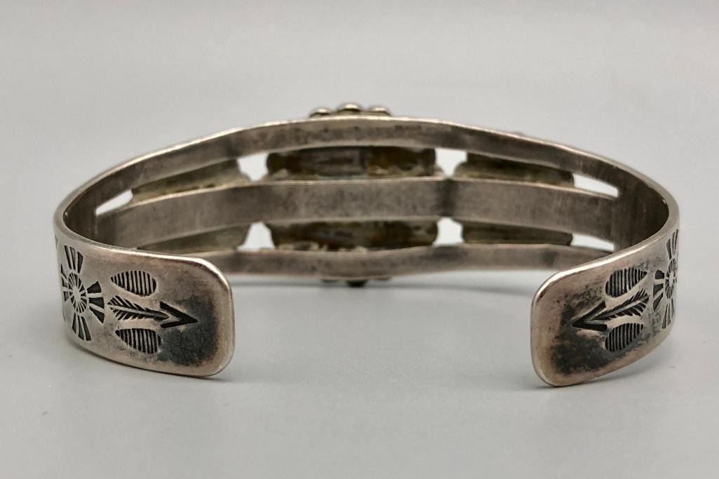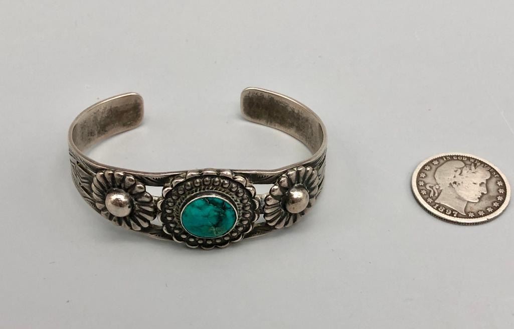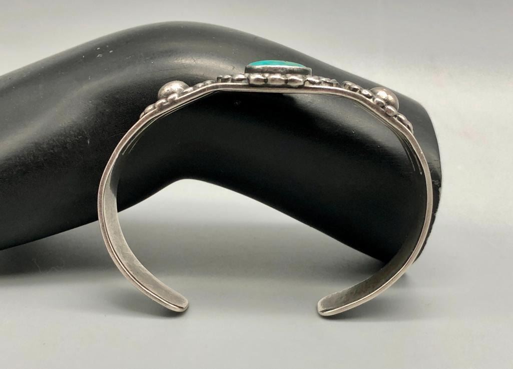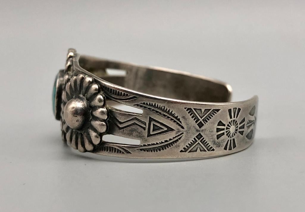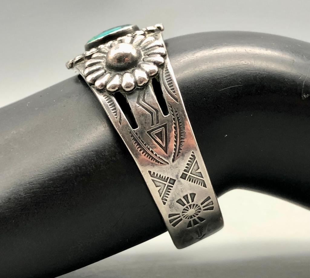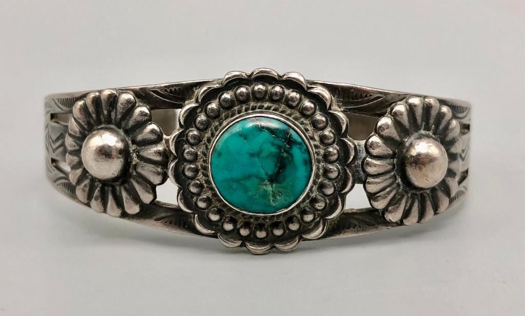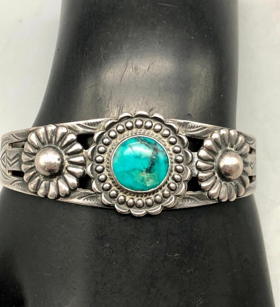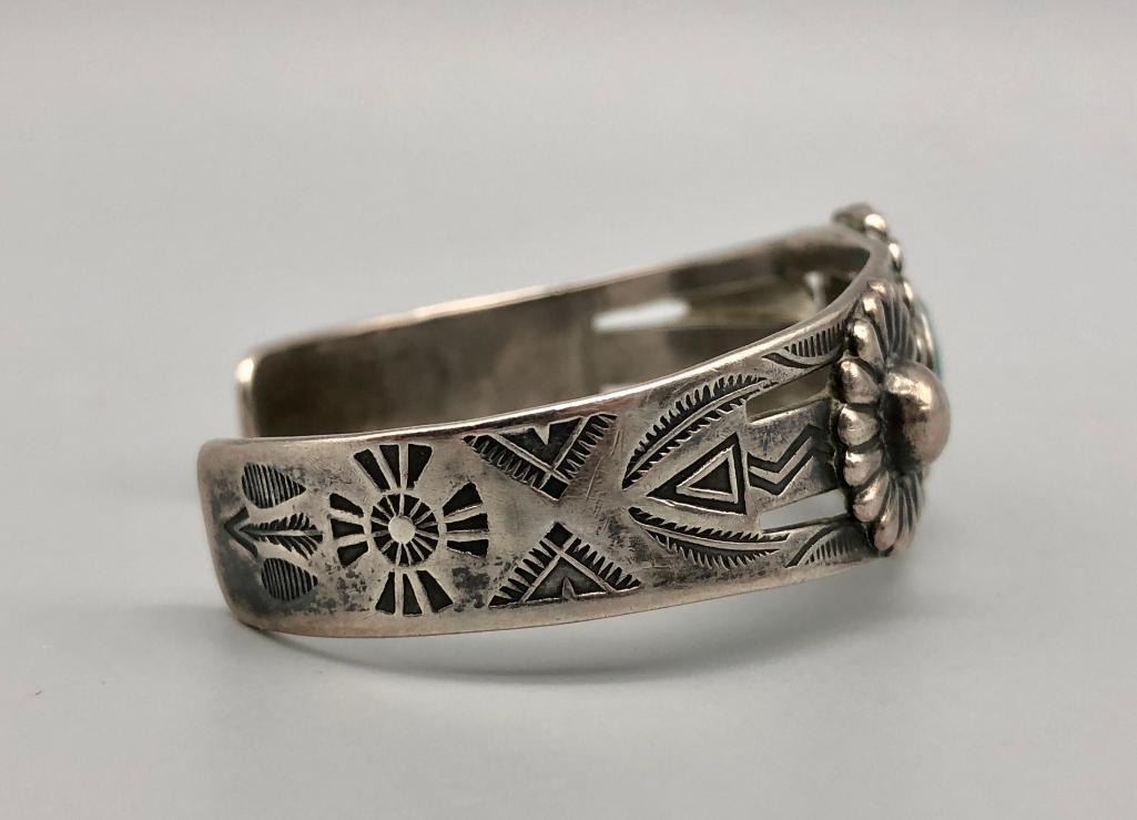 Up for consideration is this charming Fred Harvey Era turquoise bracelet. This is a great bracelet with fabulous hand stamped designs along the terminals. The center piece features a beautiful turquoise cabochon with great silverwork and cool domes on either side. It is sterling silver and will go with most anything!. MAKER/ARTIST: Unmarked. APPROX AGE: Circa 1940s. SIZE: Inside circumference measures 5-1/2 inches long. Opening is an additional 1 inch, fitting a 6-1/2 inch wrist. Width is 7/8 inches. Weighs 31.1 grams. CONDITION: Good for its age, normal wear expected. Please look closely at the pictures as they are an important part of our description and are hereby incorporated into the description, specifically with regards to condition. SHIPPING: There will be a $5 handling / packaging fee for shipping this lot. The actual cost of postage will be added on top of that. BUY IT NOW: If you would like to buy this item now, without waiting for the auction day to bid on it, we do offer this option (which is available up to 48 hours before the actual auction starts). The “Buy it Now†price is the high estimate of this lot (plus applicable fees and the Buyer's premium is discounted to 10% when using the Buy it Now option). If you would like to exercise this option, you must contact us by email (or phone as long as you talk to someone live). Reference this lot number and your intention to "Buy it Now."