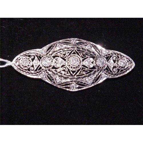 Charming lady's circa 1920 Art Deco 14kt white gold and diamond brooch set with numerous Old European Cut diamonds with a total approximate weight of 1.33 ct. set in a beautiful 14kt white gold filigree and heart motif mount. Lovely lively old cut diamonds - great clarity and color!!! Pretty heart design. Beautiful original condition. Reverse: all original ball hinge, safety catch! Great tailored look!! Great piece!