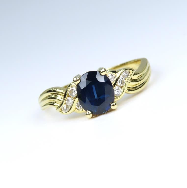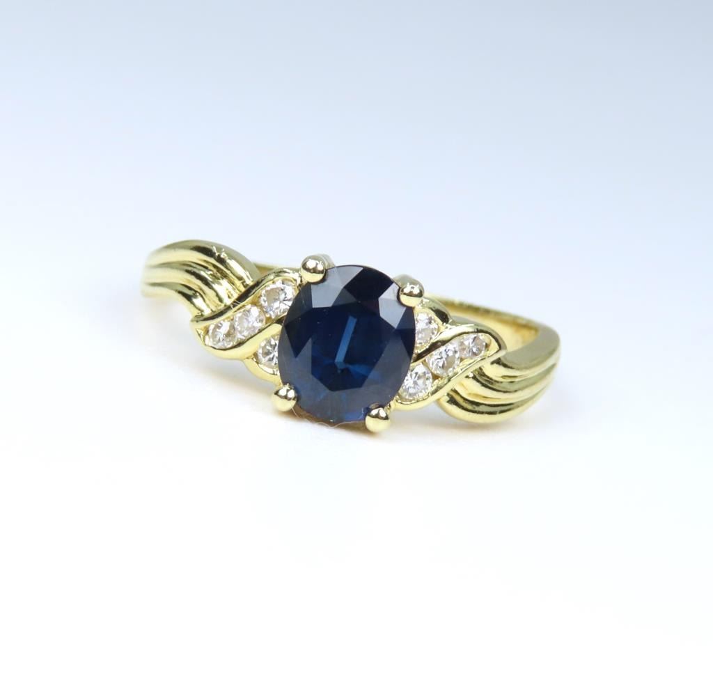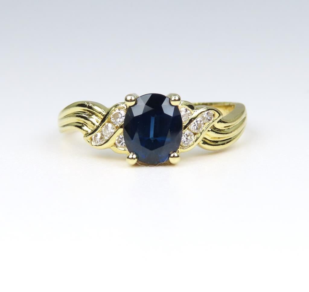 featuring an oval cut set Royal Blue Sapphire weighing approx. 1.00 carat accented with 8 round cut Diamonds set in 14 karat yellow gold setting, Size 6 ¼.