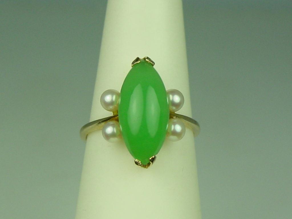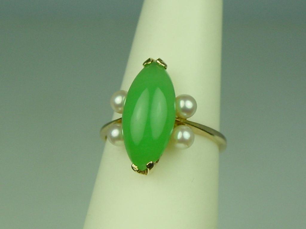 Charming Yellow Gold Ladies Ring Set with a MQ cut cabochon green jade and four side round cultured pearls Retail $650.00Set with a MQ cut cabochon green jade and four side round cultured pearls Retail $650.00