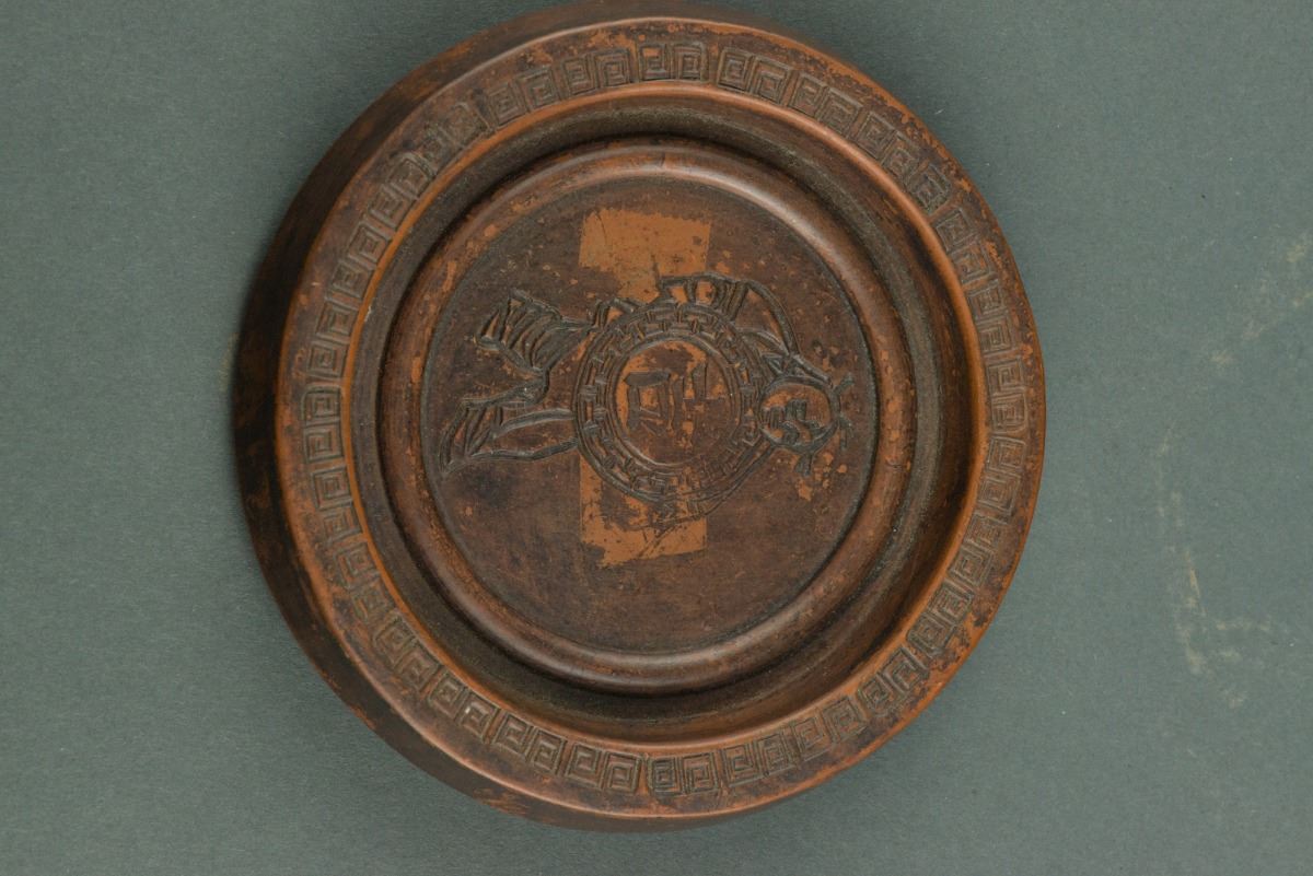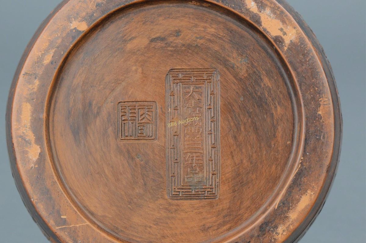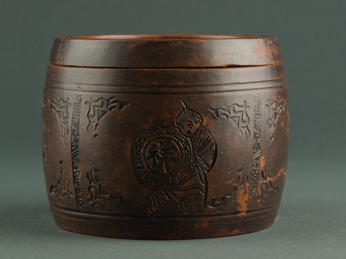 Charming Chinese Zisha carved box, of drum form, carved continuous scenes of children with auspicious words. Bottom marked Qing Xianfeng year with artist seal; H: 10 cm, W: 12 cm, 893 grams