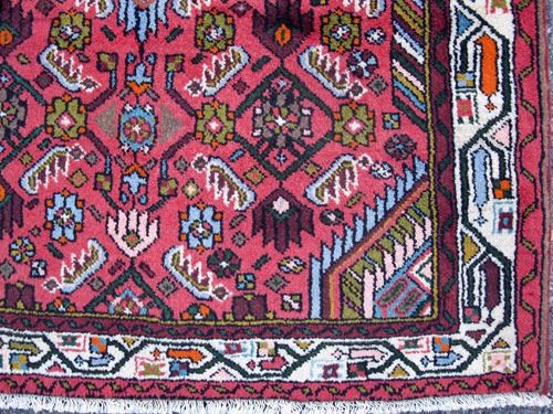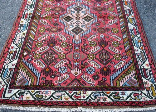 Charming and exquisite fine quality Persian Tafresh Rug. 100% natural, hand-woven, vegetable dye, baby lamb's wool pile on cotton foundation. This is a remarkable example of artistic Tafresh stylized fish design on a heartwarming rose color background embracing a charming central medallion and ultimately framed by a Talesh design border of contrasting beige. Tafresh is a small town between Hamedan and Qum. Tafresh rugs may resemble Hamedans, however they are by far of higher quality and workmanship. They have a certain presence about them, which may be partially due to its proximity to Qum; where some of the finest quality and artistic rugs are produced. Also compared to Hamedans, rugs from Tafresh have a higher number of knots per square inch. Therefore a variety of floral design and geometric patterns can be achieved. This is a perfect example of a sophisticated looking Tafresh. The creases in this rug are due to fold. They are not a defect. Size: 5 feet X 3 feet. Country of origin: Iran.