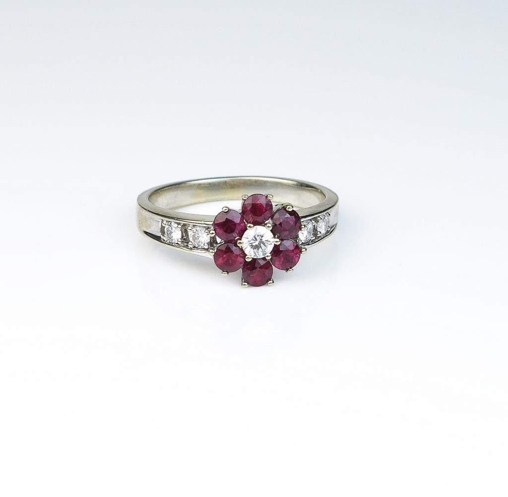 Charming floral design ring set with six Burmese color rubies and 5 ‘IDEAL’ cut diamonds of F-G colors and VS clarity with a combined weight of approx. 1.00 carat set in an 18 karat white gold setting. Retail$2,499.00 Estimates $1,000-$1,500
