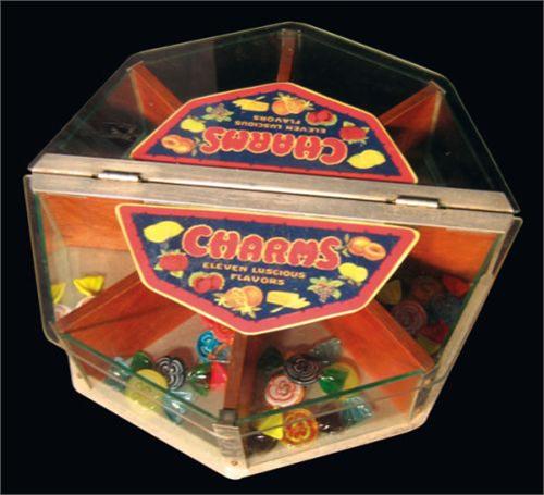 Charms Gum Dispenser, eight sided octagon, lids hinge says Charms Eleven Luscious Flavors. Swivel turntable style, mfg by Sels-Mor Products, CA. 12 X 5 inches.