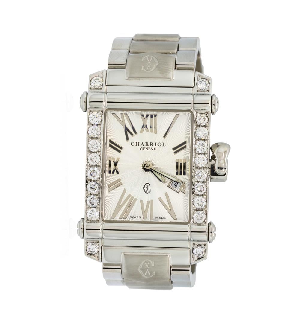 The Specifications are as follows: Dial: Silver with Roman Numeral Markers, Case: Stainless Steel 25mm x 40mm with (20) Round Brilliant Diamonds with an approximate weight of 0.80ctw, Movement: Quartz, Bracelet: Stainless Steel with Hidden Deployment Clasp, Water Resistant up to 30 meters.
