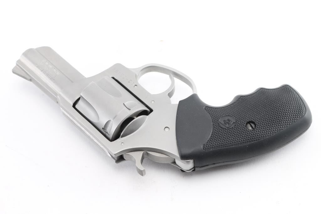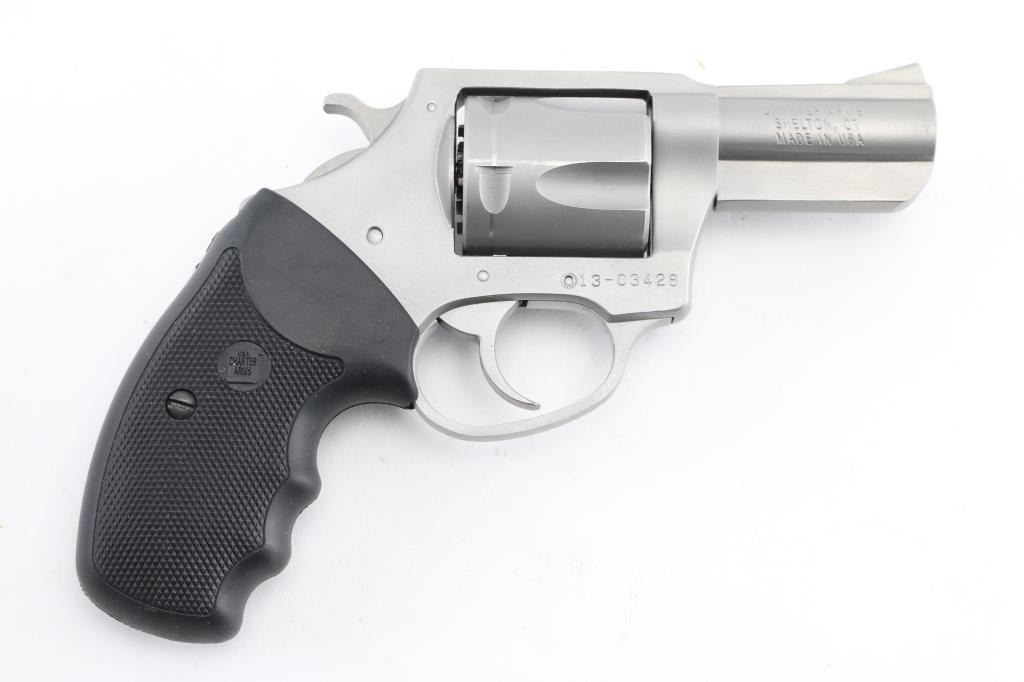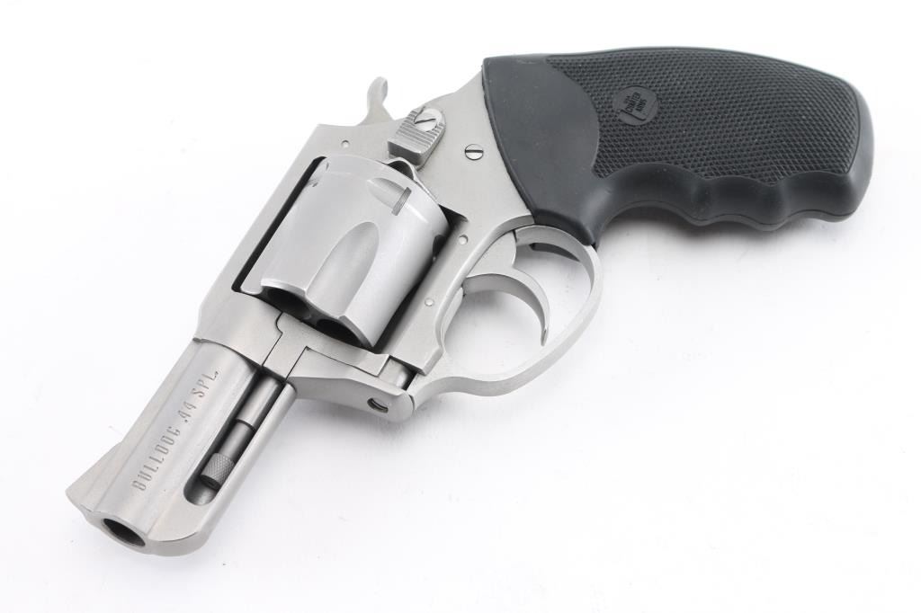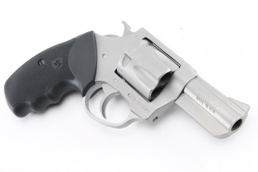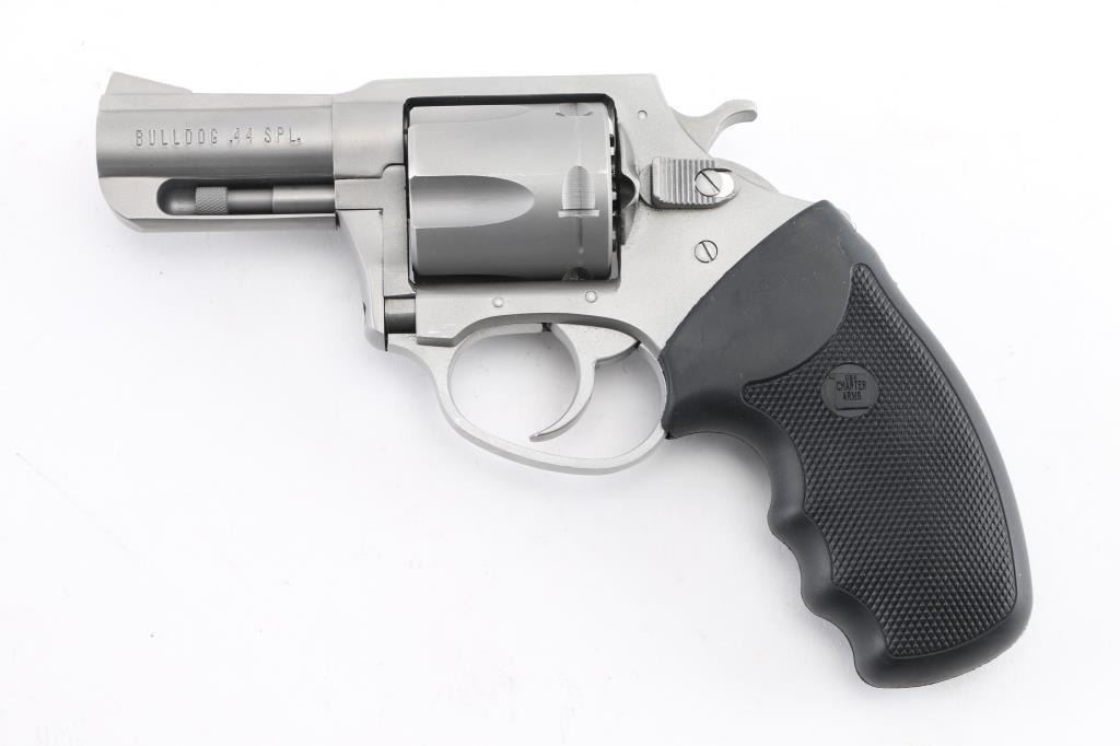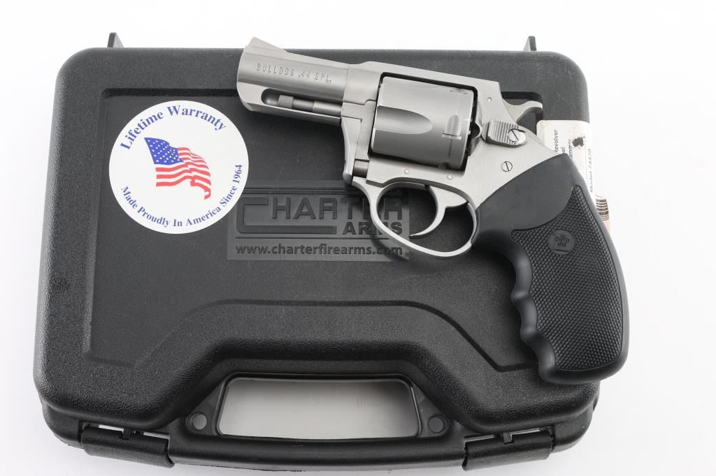 American made stainless steel double-action snub nosed revolver chambered in .44 Special. Features a matte finish, 2 1/2" barrel with solid sighting rib & full underlug, serrated ramp front sight, square notched rear sight, smooth trigger, alloy trigger guard, serrated hammer spur, transfer bar safety, fluted five-shot cylinder, factory checkered, black rubber finger groove wrap-around grips. Includes the original factory hard case with documents. Revolver exhibits a light drag line on the cylinder and a few minor handling marks with no major wear observed. Action is smooth with very good+ lock-up, the bore is excellent and the grips are excellent. Condition is NRA Excellent in case. Modern Firearm.
