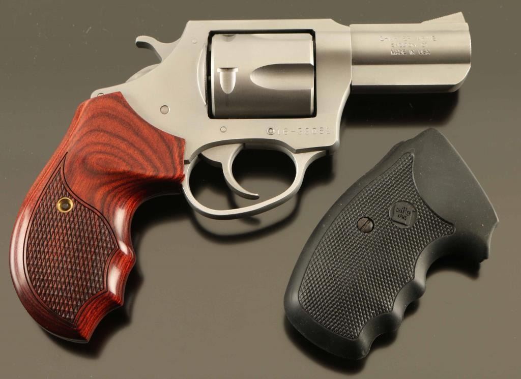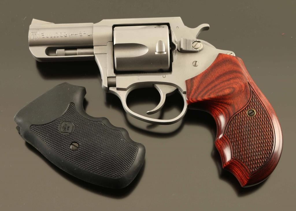 American made stainless steel double-action snub nosed revolver chambered in .44 Special. Features a matte finish, 2 1/2" barrel with solid sighting rib & full underlug, serrated ramp front sight, square notched rear sight, partially serrated trigger, alloy trigger guard, serrated hammer spur, transfer bar safety, fluted five-shot cylinder, and two-piece laminated rosewood finger groove wrap-around grips. Includes the original factory hard case with documents, lock & the factory black rubber grips. Revolver exhibits a light drag line on the cylinder and a few minor handling marks with no major wear observed. Action is smooth with very good+ lock-up, the bore is excellent and the rosewood grips are extra fine. Condition is NRA Excellent in case. ***Modern Firearm***