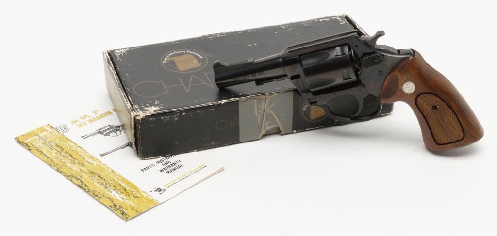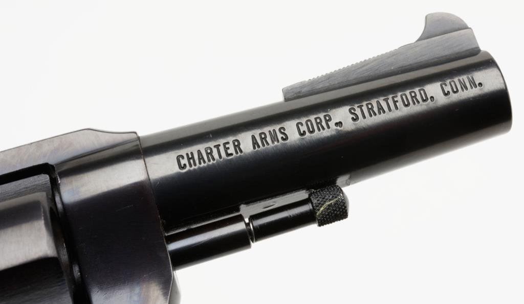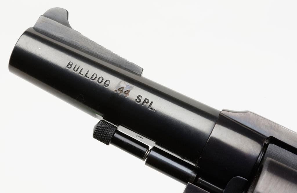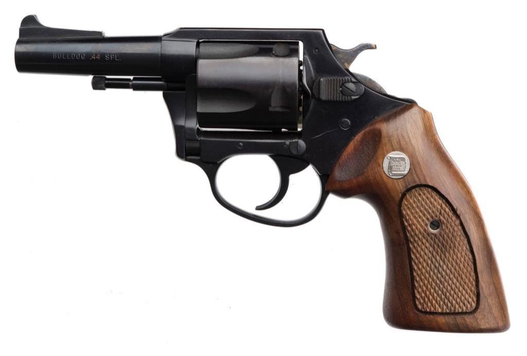 *Charter Arms Bulldog Model DA revolver, .44 Special caliber, 3” barrel, S/N 724677, black finish, checkered wood medallion grips in fine condition showing little use or handling; with factory box. Est.: $200-$400.