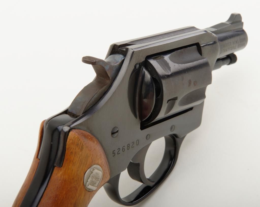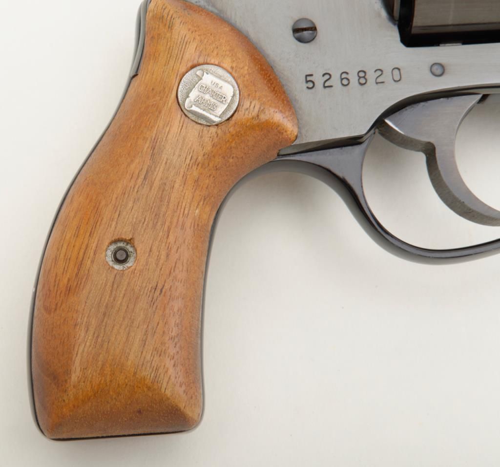 Charter Arms DA revolver, .38 Special cal., 2” barrel, blue finish, smooth wood medallion grips, #526820 in overall very good to fine condition showing the majority of its original finish with a couple spots of surface rust from storage on thecylinder, fine bore, action, markings and grips. NO CALIFORNIA SALE TO PRIVATE PARTY. Est.: $150-$300.