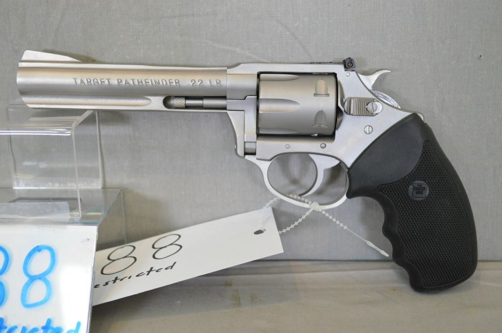 Charter Arms Mod Target Path Finder .22 LR cal 6 shot Revolver w/ 127 mm bbl [ grey stainless finish, rubber Charter Arms grips, appears as new, test fired, in orig foam lined box ] Ser # 1322240