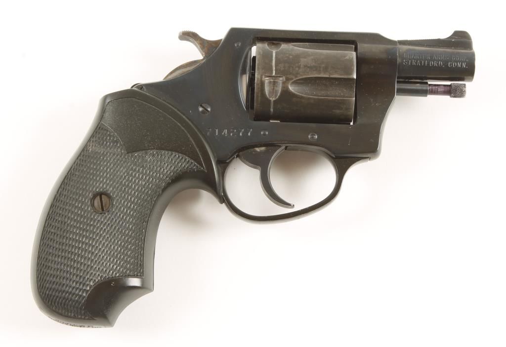 Double action 5-shot revolver. Blued finish except for the color case hardened hammer and the black grip frame/trigger guard. 1-7/8" barrel with serrated ramp front sight. Rear sight is fixed channel in frame. Cylinder finish is poor/faded with a heavy drag line. Alloy ejector head checkering is worn. bore is good with strong rifling. Black rubber Pachmayr grips. Condition: Fair *Modern Firearm*