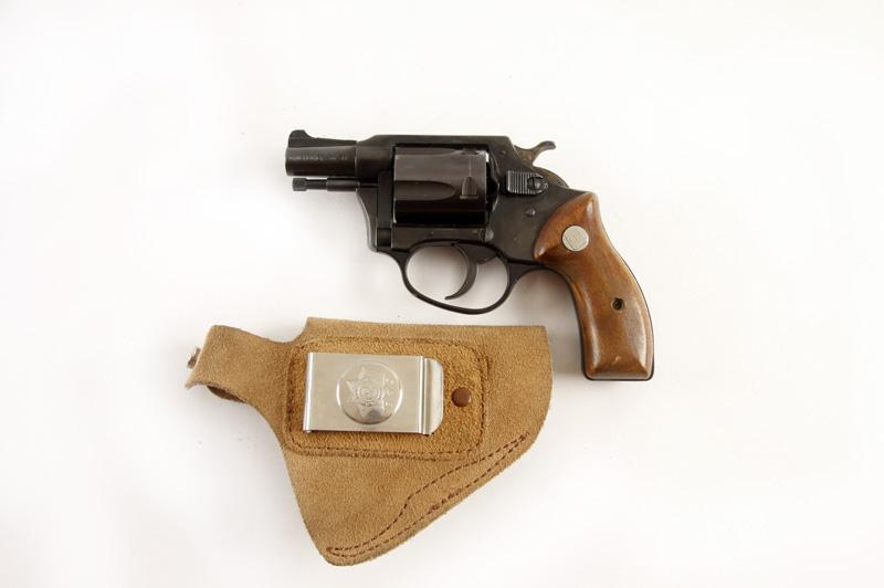 Condition: Excellent with not a lot of use, slight cylinder ring. InConcealed carry type double action 5 shot revolver. Blued finish, smooth wood grips, 1 7/8" barrel with fixed sights, good bore and action. Condition: Excellent with not a lot of use, slight cylinder ring. In Bianchi leather holster.