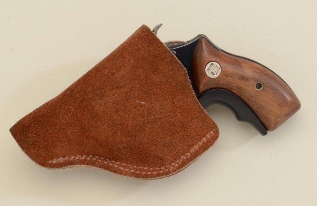 Charter Arms Undercover Model DA revolver, .38 cal., blue finish, wood grips, #687969 in overall excellent condition with grip shoe and lightweight clip-on holster. Est.: $150-$250.