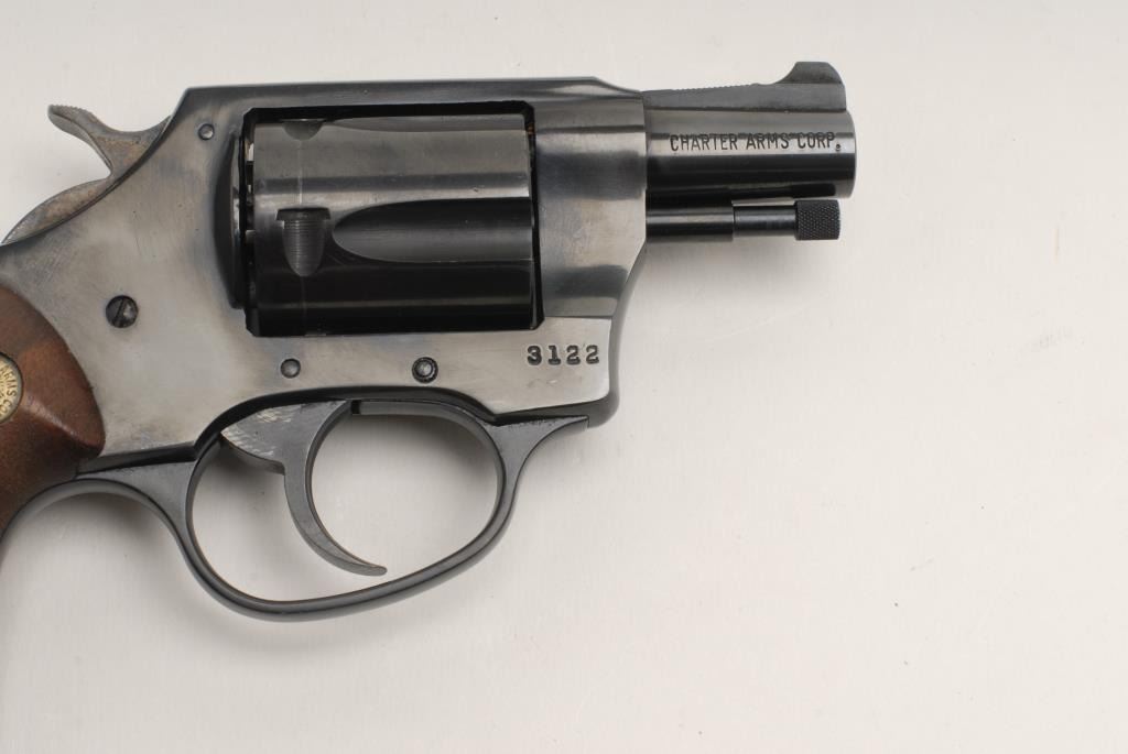 Charter Arms Undercover Model revolver, .38 Special cal., serial #3122. The pistol is in very good overall condition with a 1 7/8” barrel with a ramp front sight. The pistol retains the majority of its muted blue finish with only lighthandling marks noted. The smooth wood medallion grips are in very good condition with small mars from storage. The bore is very good, the action crisp and markings are sharp. Est.: $175-$275. (Modern).