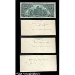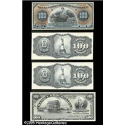 <B>Chartered Bank Specimens and Proofs.</B></I><BR>Toronto, ON - Canadian Bank of Commerce $100 Jan. 2, 1901 Charlton 75-14-58S Choice CU, PC<BR>Montreal, PQ - Banque Canadienne Nationale $100 Feb. 1, 1925 Charlton 85-10-10P Face and Back Proofs CU, corner folds far from note<BR>Montreal, PQ - Bank of Montreal $100 Jan. 2, 1931 Charlton 505-58-10P Face Proof Only Choice CU<BR>Montreal, PQ - Banque D'Hochelaga $100 May 2, 1898 Charlton 360-18-18Pa Face and Back Proofs Choice CU<BR>Montreal, PQ - Banque D'Hochelaga $100 Feb 23, 1911 Charlton 360-20-10Pa Face and Back Proofs Choice CU, face PC.<BR>All of the proofs have penciled notations on the backs and are printed on card stock or thin paper which is then mounted on card stock. The Bank of Montreal proof is not listed in Charlton.<BR> 8 items Lot:15514
