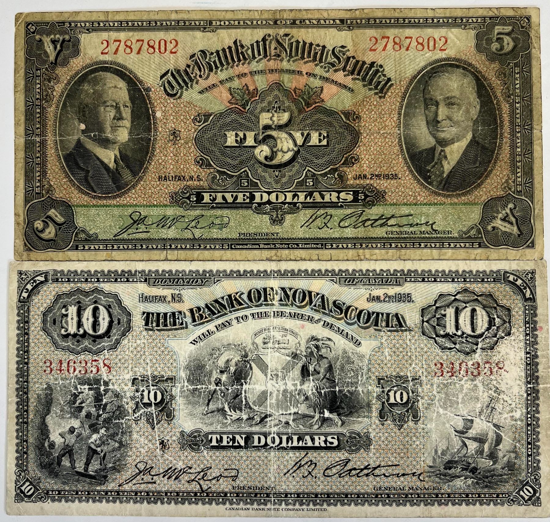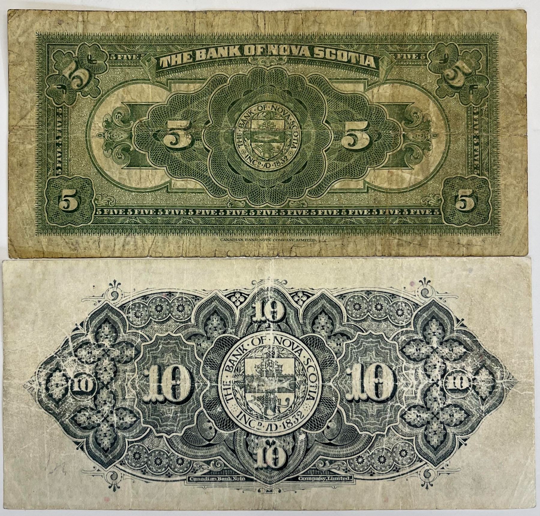 Chartered Banknote Lot; The Bank of Nova Scotia Mixed denominations, varieties and signatures. Lot of 2 notes. F to VF. A nice lot!