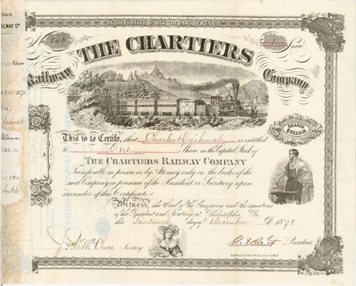 1879, Pennsylvania. Stock certificate for 1 shares. Black. Multi-vignette of large train at top center, railroad worker at right and female figure at bottom center. Punch cancelled. Very fine.
