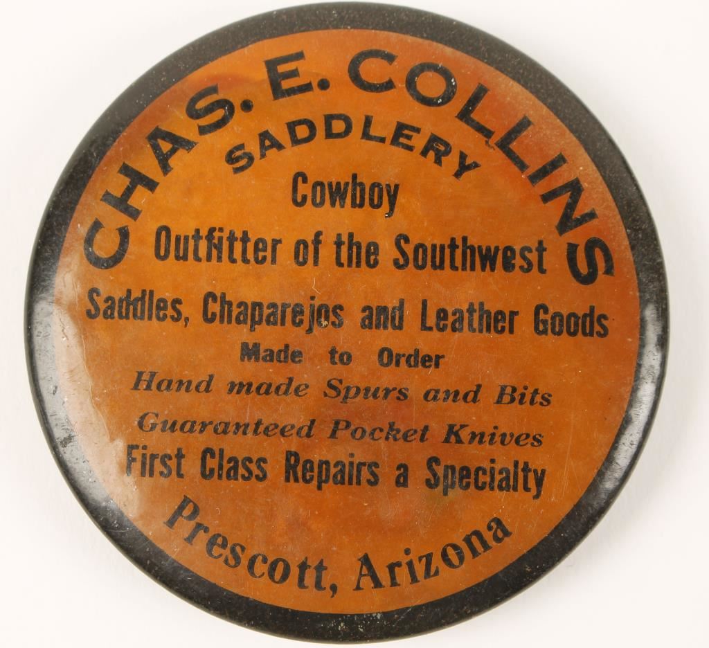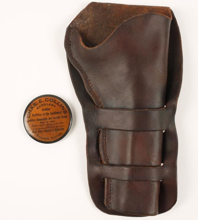 This unique 2" round sharpening stone has a metal face which reads "Saddlery Cowboy Outfitters of the Southwest. Saddles, Chaparejos, and Leather Goods, made to order. Hand made Spur and Bits, Guaranteed Pocket Knives, First Class Repairs A Specialty PRESCOTT, ARIZONA". A leather double loop holster is also included presumably made by Chas Collins but is unmarked.