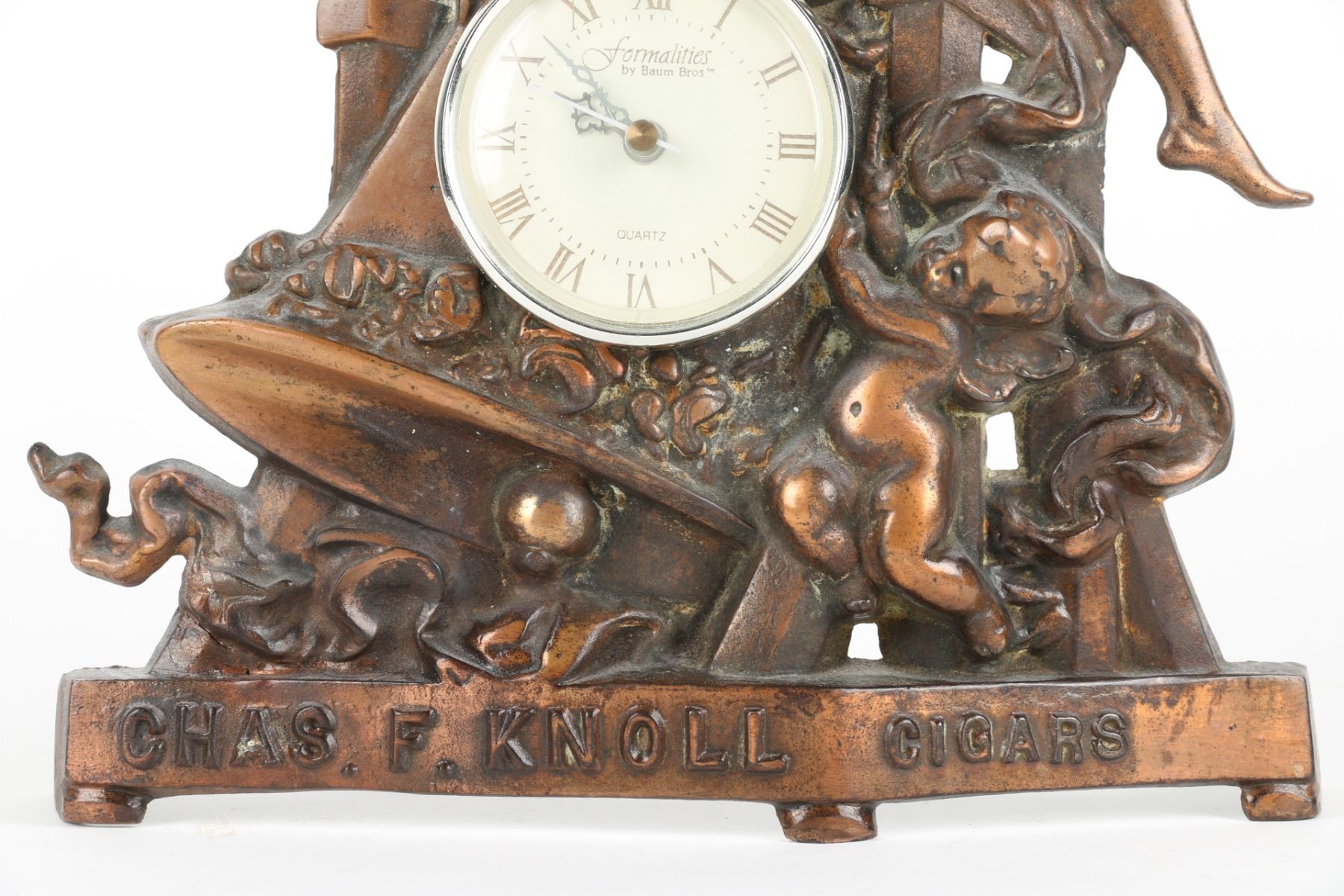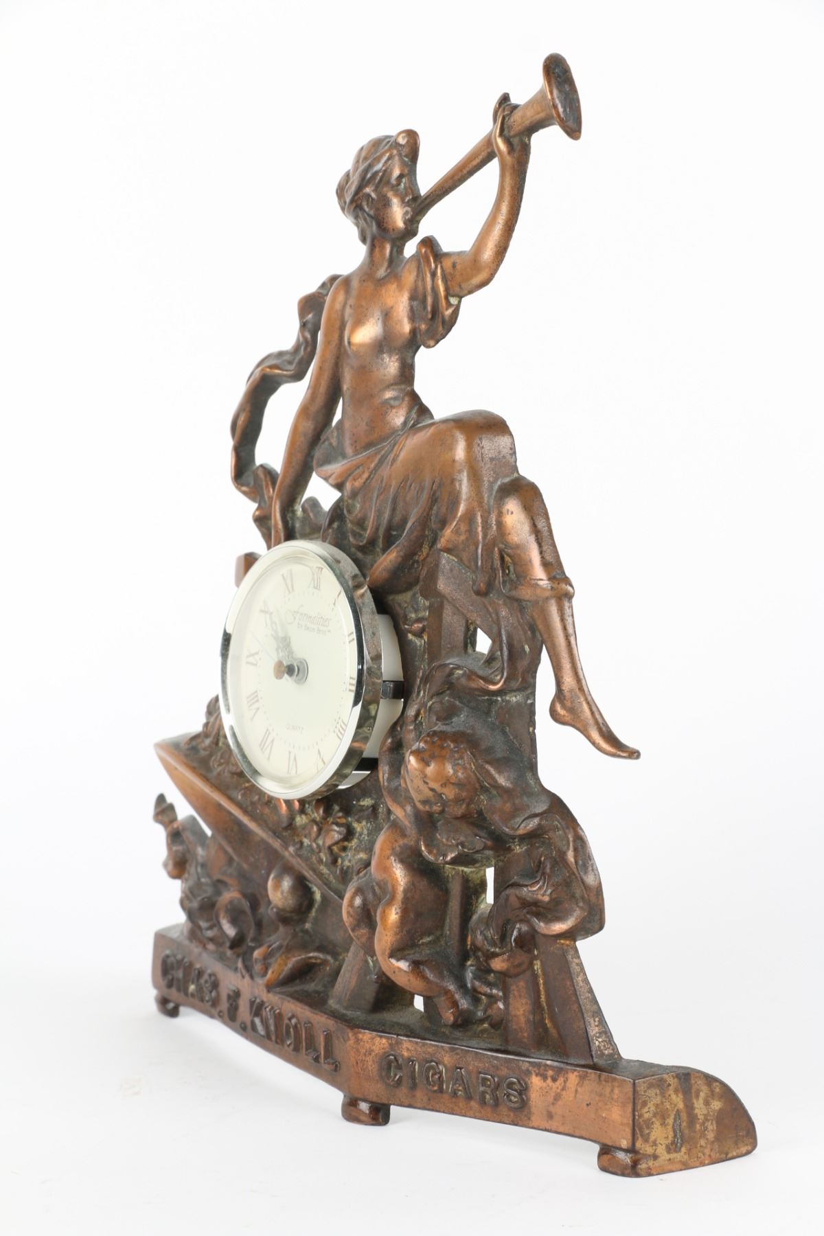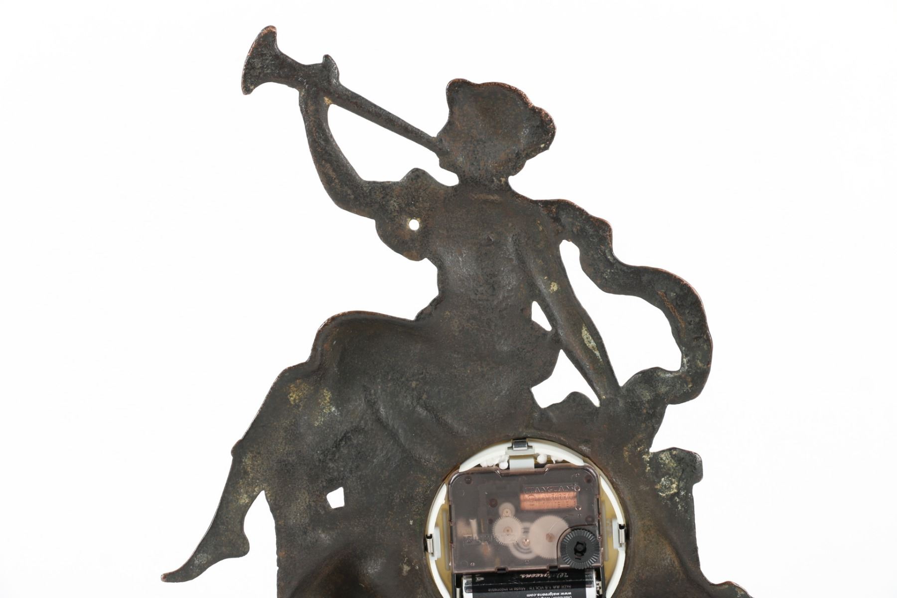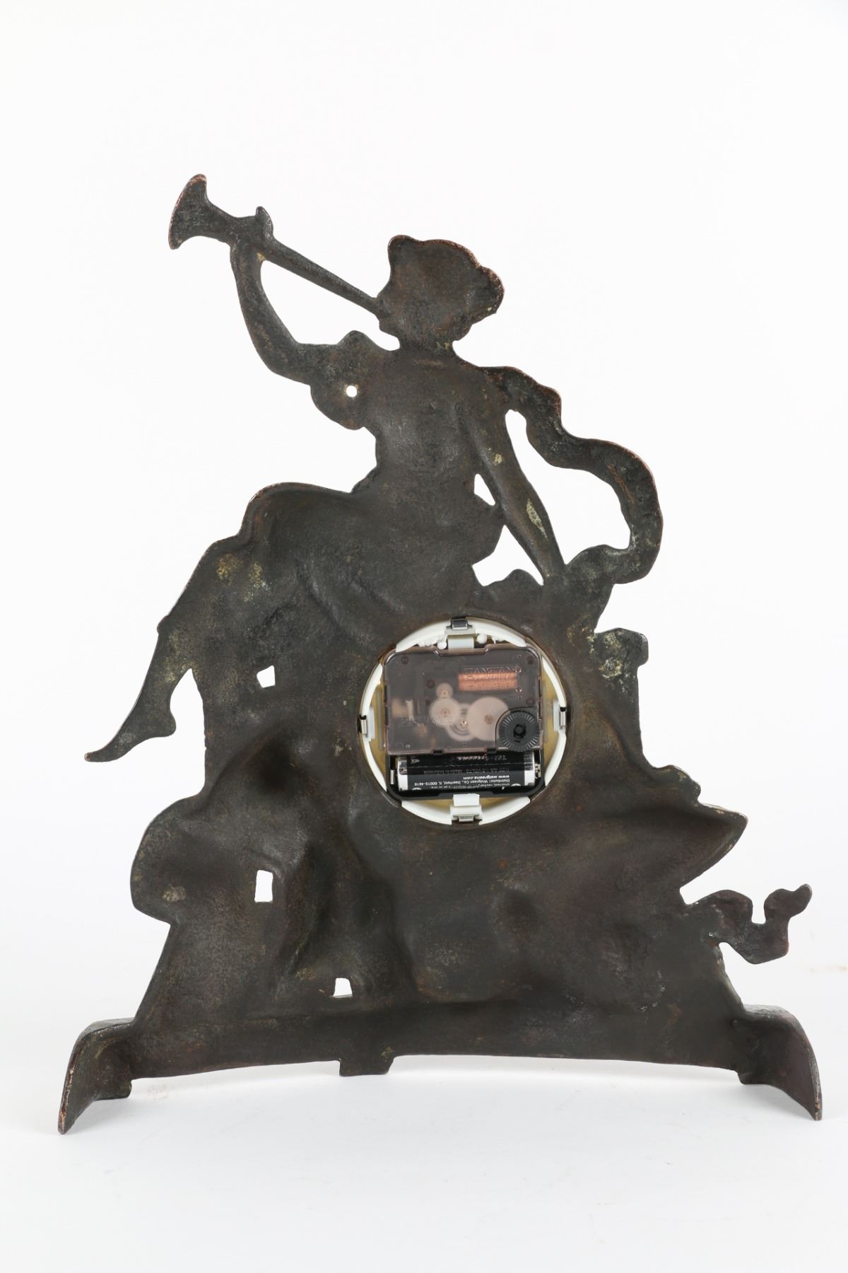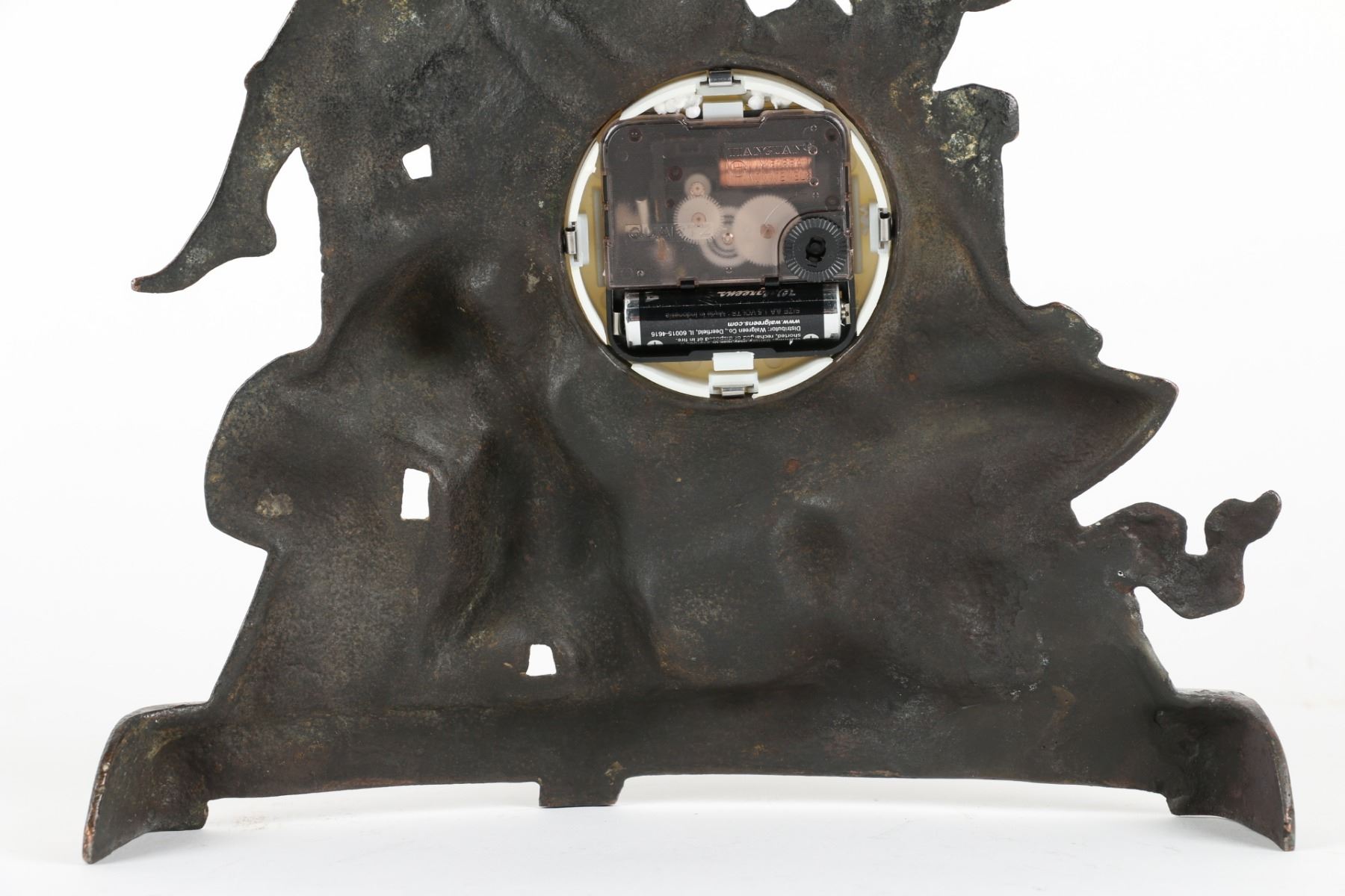 Cast iron. American. Replacement clock. 12.5” x 9.5” x 3”. Professional restoration to cast, lower left corner. Replacement clock. $300-500.